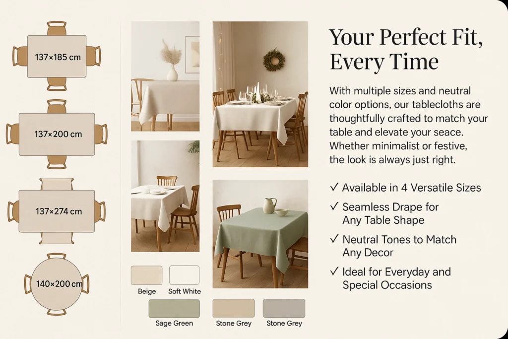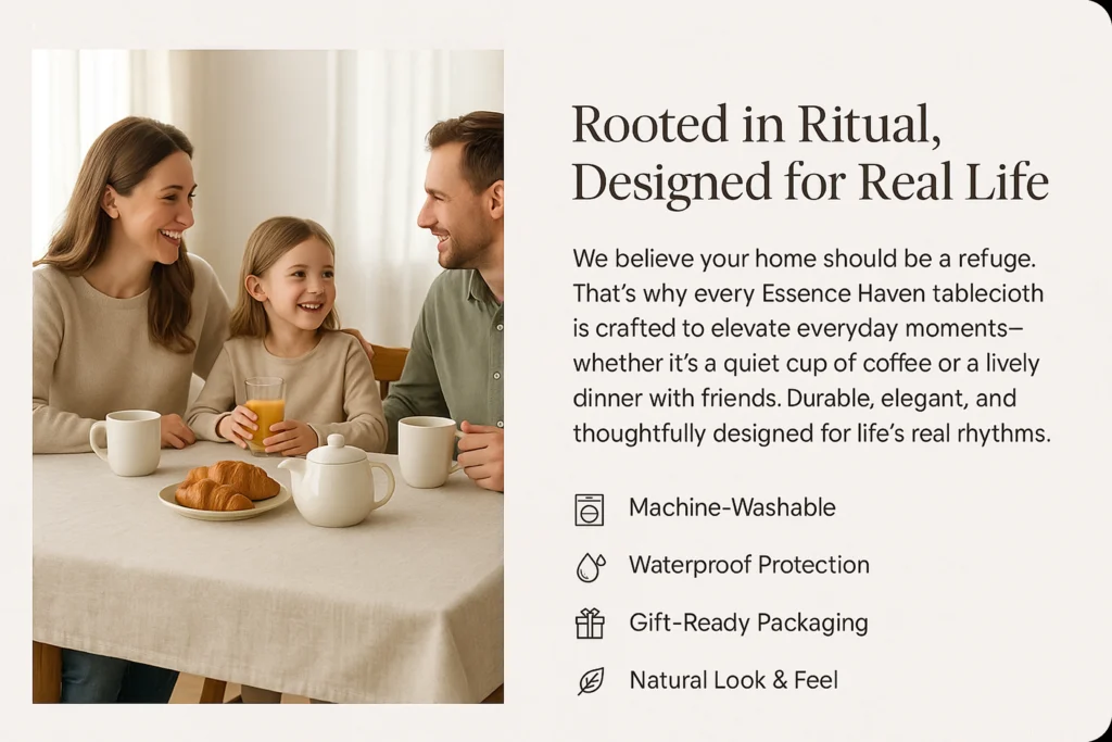 Our Essence Haven tablecloth has made our dining area feel like a restaurant. It’s thick, seamless, and super easy to clean just a quick wipe and it’s ready for the next meal. I love that it brings warmth and sophistication without the fuss.